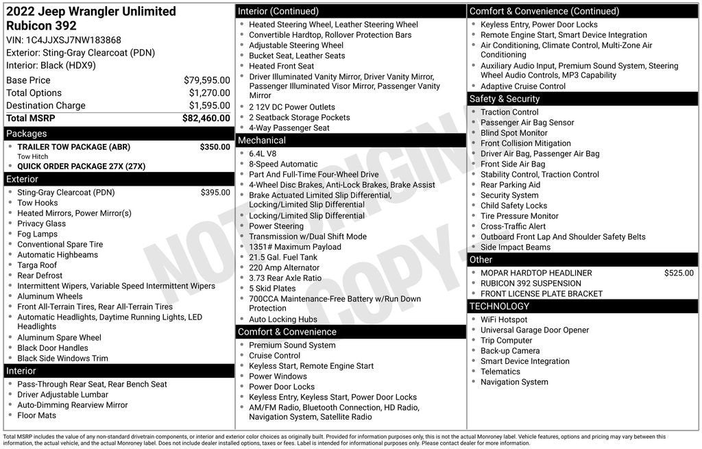 Beyond its impressive performance, the Wrangler Unlimited Rubicon 392 is packed with an array of premium features that elevate the driving experience. Enjoy the convenience of Apple CarPlay/Android Auto, the comfort of heated front seats and a heated steering wheel, and the peace of mind provided by advanced safety technologies like ParkView Rear Back-Up Camera and Blind Spot Monitoring.