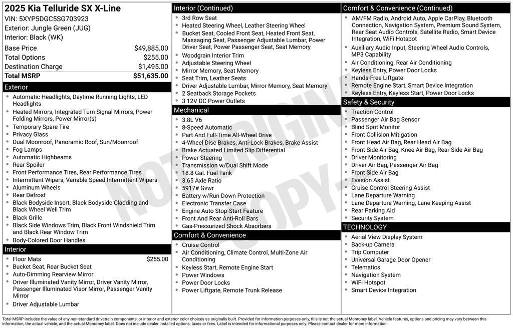 This 2025 Kia Telluride SX X-Line is a standout in the full-size SUV segment, combining exceptional capability, advanced technology, and refined style. With its striking Green exterior and impressive 3.8L V6 DOHC engine paired with an 8-Speed Automatic transmission and All-Wheel Drive, this Telluride delivers a thrilling driving experience while maintaining impressive fuel efficiency with 18 MPG in the city and 23 MPG on the highway.